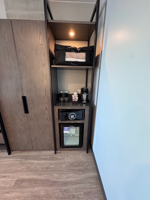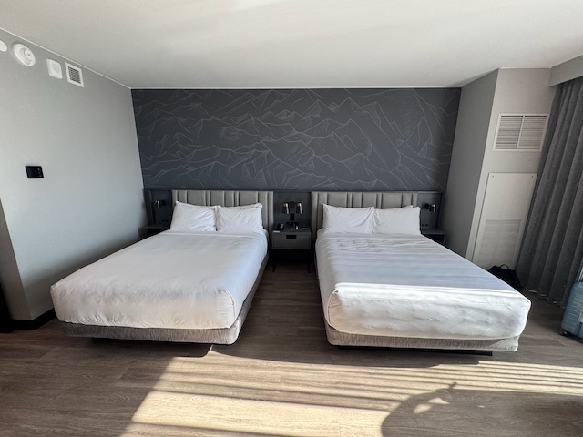 The room was incredibly spacious. I appreciated not having carpet in the room. The floors are luxury vinyl plank from what I could tell. I also appreciated the big coat rack on the wall near the door. We didn’t need it in July when we visited but I’m sure it would be very helpful in the colder months.