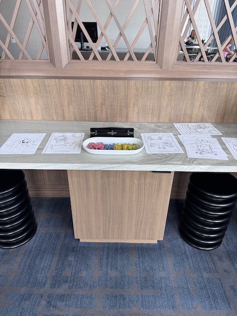 I really appreciated the coloring pages and crayons laying out in the lounge as a super kid friendly touch. I would love to see some more kids games or board games in the lounge to check out and use.